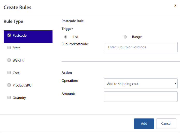 - A List or a Range of postcodes can be set on Postcode Rule.