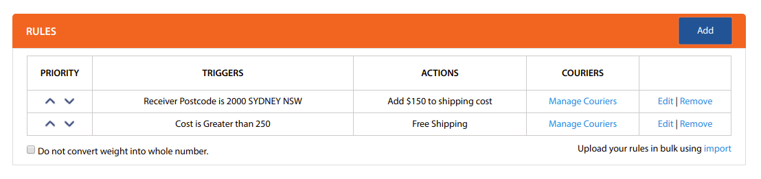- Rules enable you to add conditions to quotes based on the Rule type selected such as Postcode, State, Weight, Cost, or Product SKU.