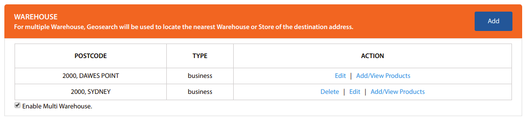 - This option will let you add multiple Postcode and Type (Business or Residential) for the desired pickup Warehouses.